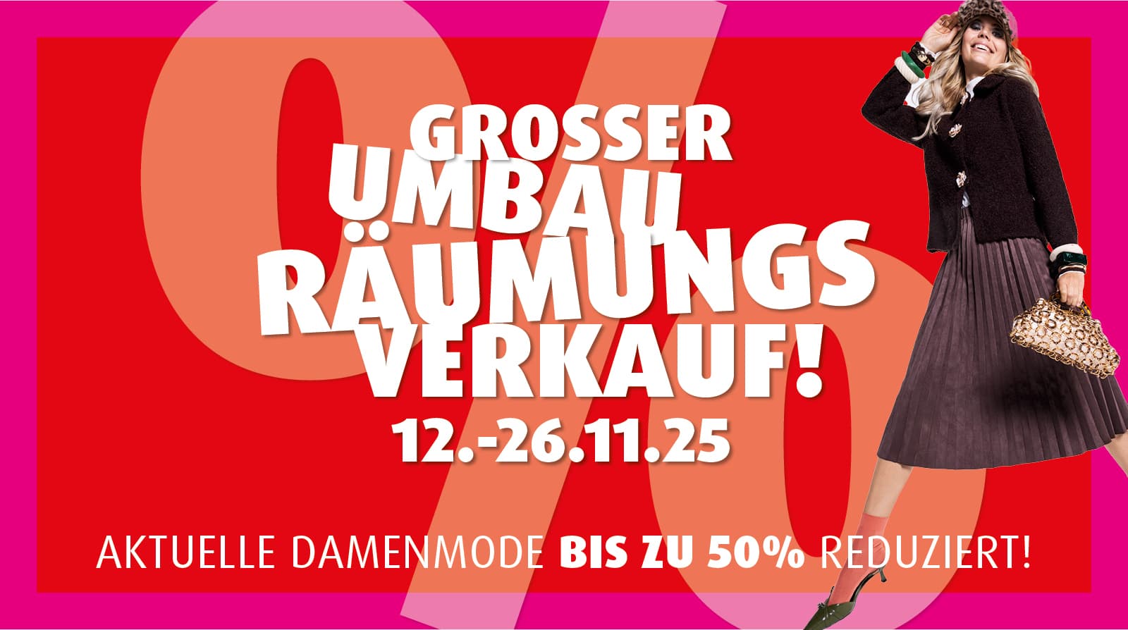Wir bauen im Damenhaus um und brauchen dafür Platz! Profitieren Sie daher vom 12.-26.11.25 von vielen reduzierten Markenartikeln und tollen Kollektionen, die wir bis zu 50% im Preis gesenkt haben. Wie immer gilt: Schnell sein lohnt sich…