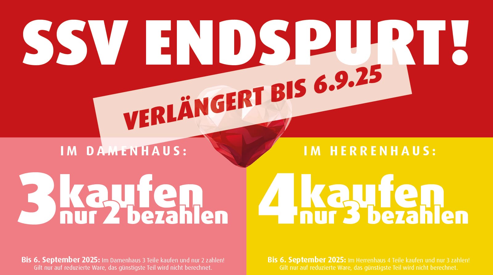 Wir reduzieren unsere Marken-Sommerware nochmals stark für Sie und schenken Ihnen beim Kauf von 3 bzw. 4 Lieblingsstücken sogar einen Artikel! Nutzen Sie jetzt die Möglichkeit, im Damen- oder Herrenhaus nochmal richtig zu sparen (und freuen Sie sich auf unsere angenehm klimatisierten Räume). Wir freuen uns auf Sie!