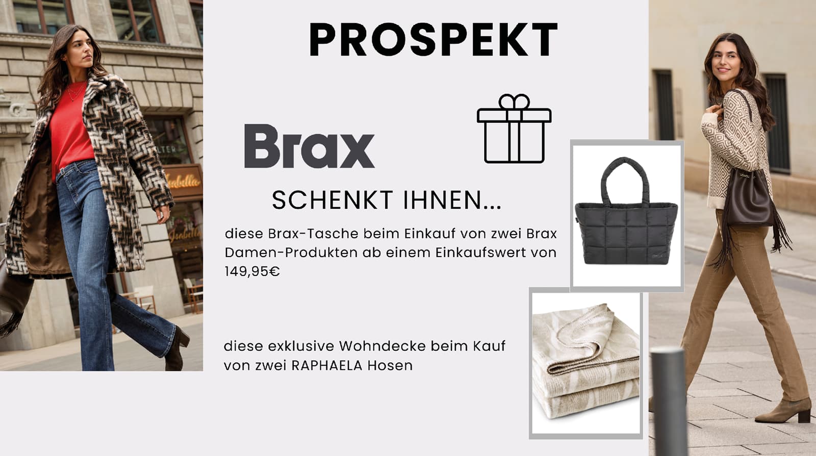 Genießen Sie die neue BRAX Kollektion und profitieren Sie: Beim Kauf von zwei BRAX-Artikeln Ihrer Wahl schenken wir Ihnen ab einem Einkaufswert von 149,95€ eine hochwertigen BRAX-Tasche. Und beim Kauf von zwei RAPHAELA-Hosen sogar eine exklusive Wolldecke! Es lohnt sich also, bei uns vorbeizuschauen, wir freuen uns auf Sie!